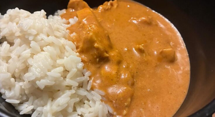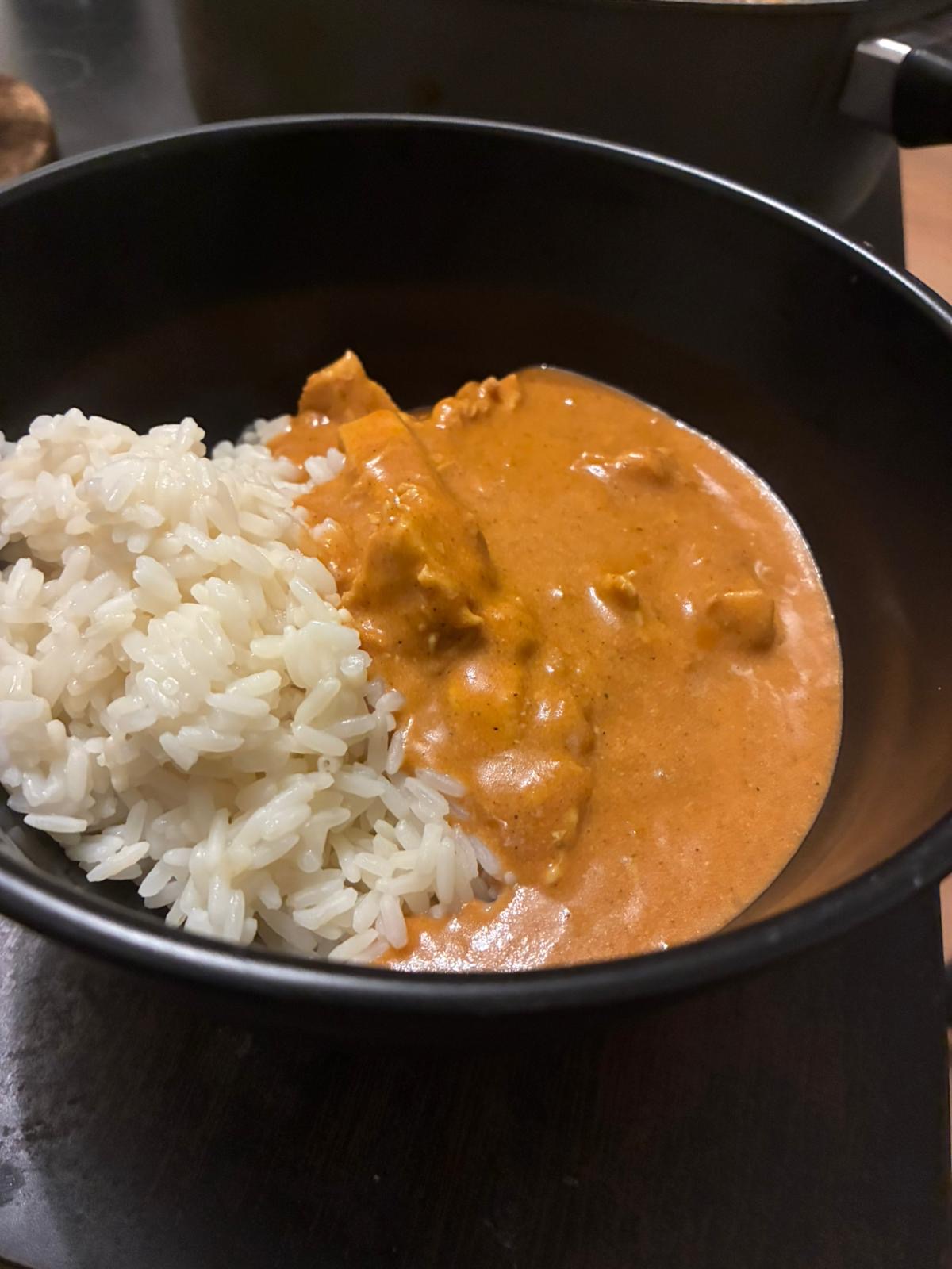 Das Fleisch in kleine, mundgerechte Stücke schneiden und im Topf mit 2 EL Butter anbraten. Anschließend Ingwer, Zwiebeln und Knoblauch dazugeben und kurz mit andünsten.